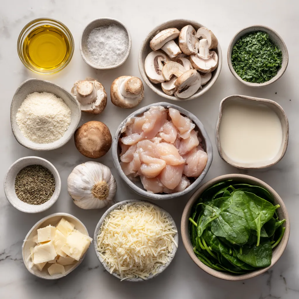 Keywords: chicken spinach mushroom casserole, creamy baked chicken casserole, one pan chicken dinner, family friendly comfort food, easy oven casserole, weeknight chicken bake, spinach and mushroom recipes